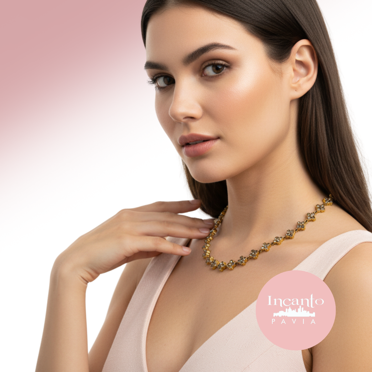 Scopri la nostra collana must-have: un gioiello raffinato che valorizza ogni décolleté con luce e stile. Realizzata con dettagli dorati e cristalli scintillanti, è perfetta per le occasioni speciali… o per sentirti speciale ogni giorno