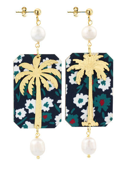 Orecchini in ottone placcato oro, elementi e pietre naturali. Lunghezza 8,5 cm. Chiusura a perno e farfallina. Made in Italy