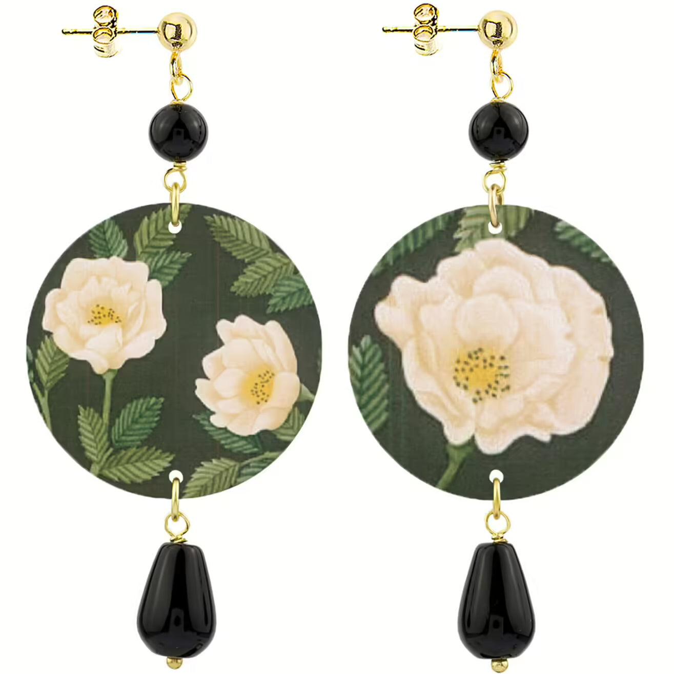 Orecchini composti da una capsula piatta stampata. Elementi in ottone galvanizzato oro e pietre naturali. Lunghezza 8,5 cm.