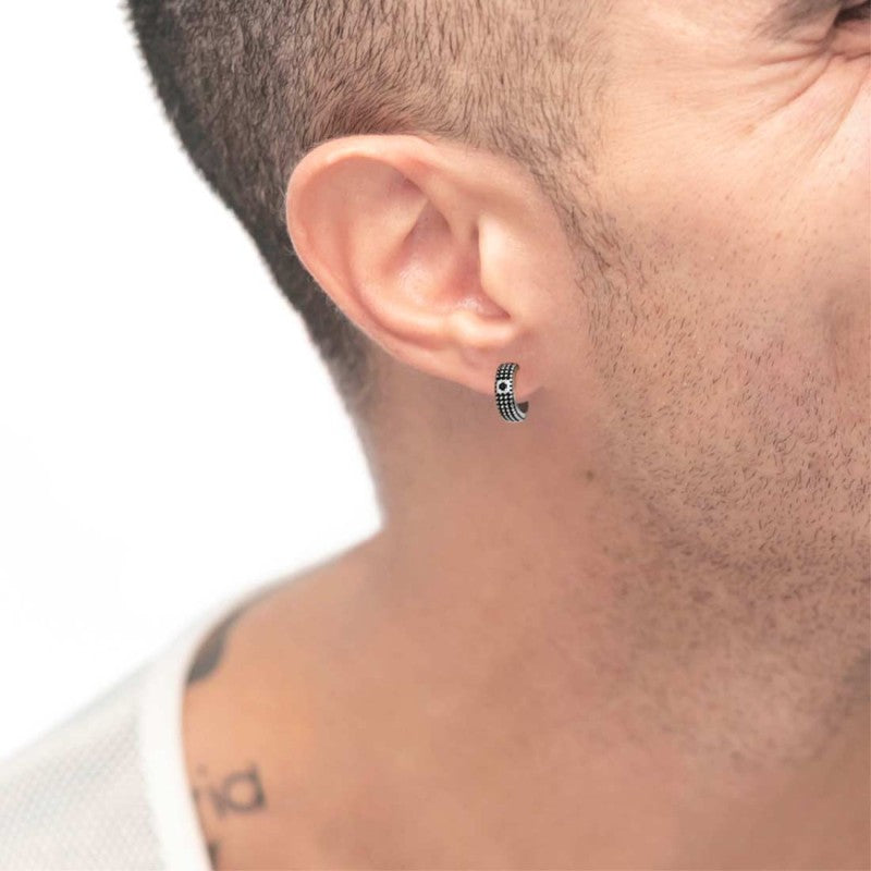 Mono orecchino a cerchietto in acciaio con trama puntinata con black oil opaco e con cristallo nero. Nella parte interna Marlù logo laserato. Materiali: acciaio, cubic zirconia, black oil opaco