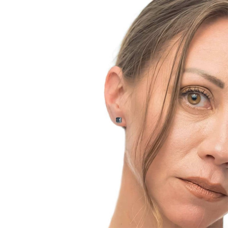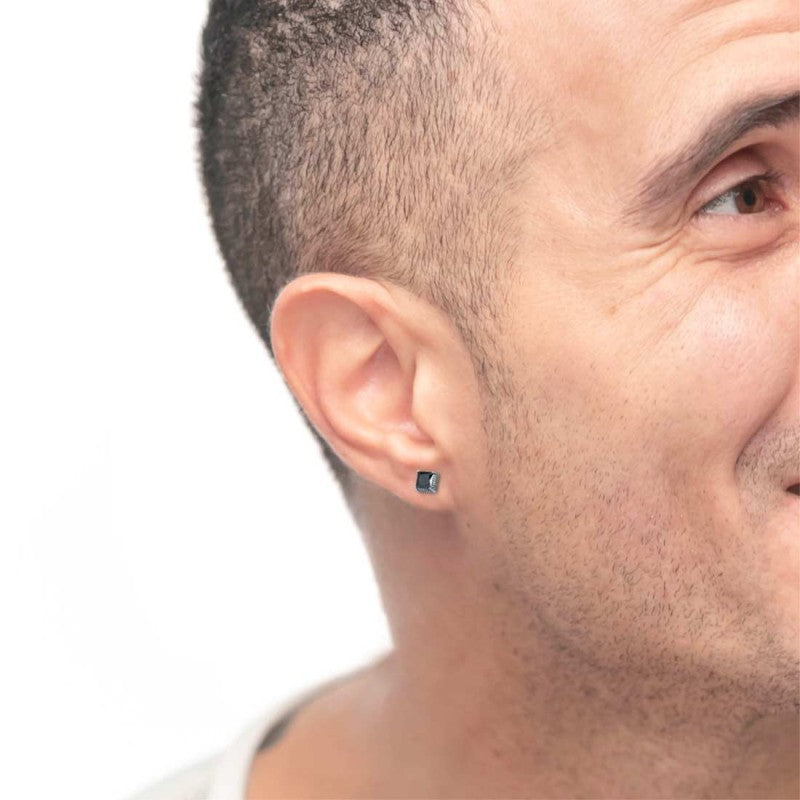 Mono orecchino a lobo in acciaio con cubic zirconia nero 0,7x0,7cm inserito in elemento quadrato con trama puntinata con black oil opaco. Sul retro Marlù logo laserato. Materiali: acciaio, cubic zirconia, black oil opaco