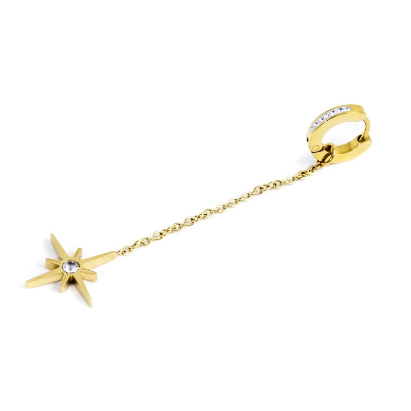 Mono orecchino cerchio in acciaio con cristalli bianchi sul fronte, con catena cross e con pendente a forma di rosa dei venti con cristallo al centro. Lunghezza 6,5cm