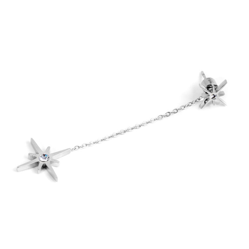 Mono orecchino rosa dei venti con cristallo con catena cross con pendente a forma di rosa dei venti con cristallo al centro.